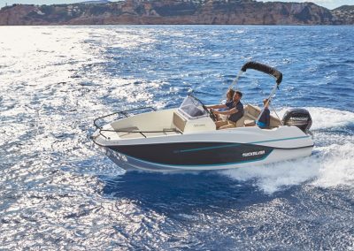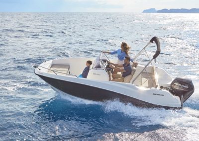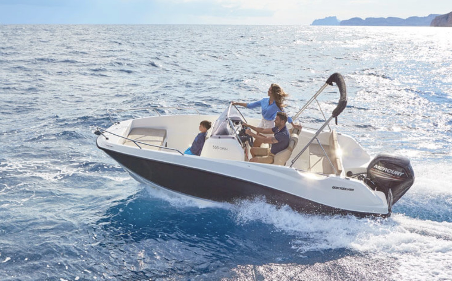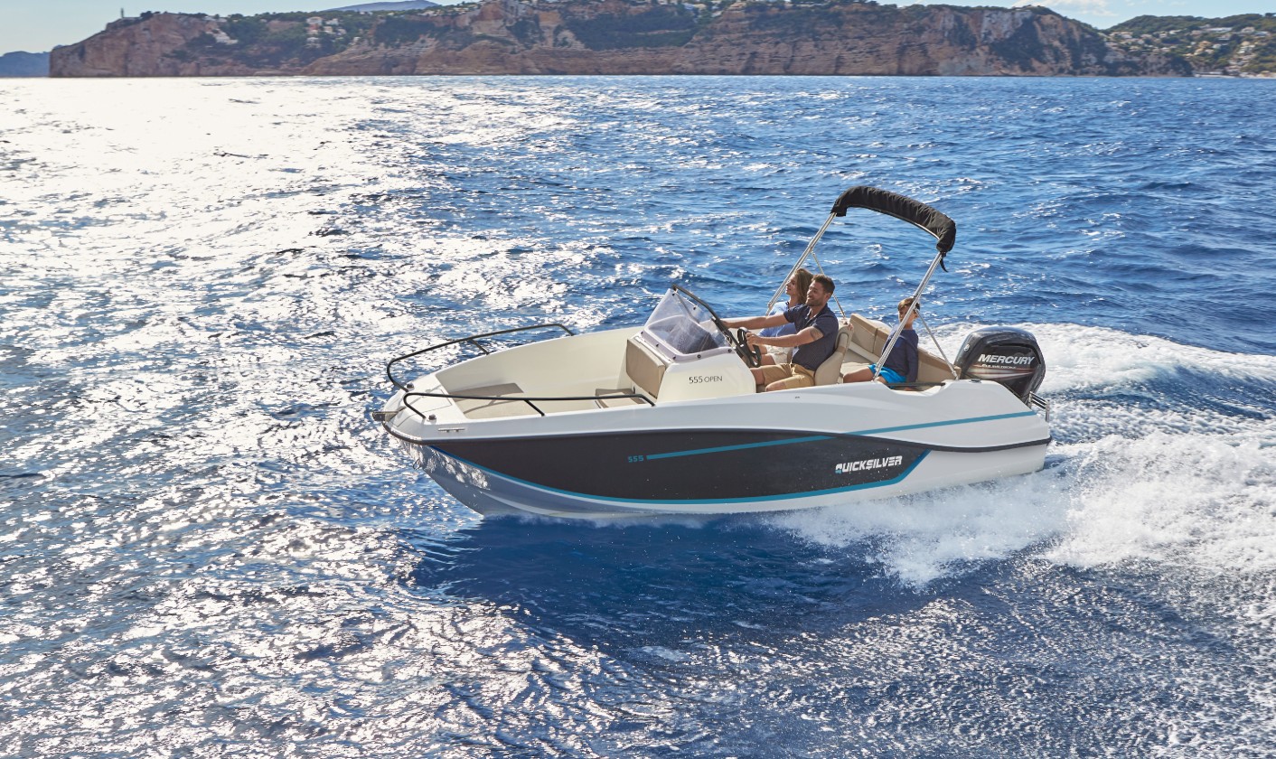 Embarcación Quicksilver Activ 555 Open con capacidad para 6 personas a bordo, motor Mercury de hasta 115cv y su casco en forma de M para ayudarte a ponerte en planeo más rápido con mayor estabilidad y fácil manejo
